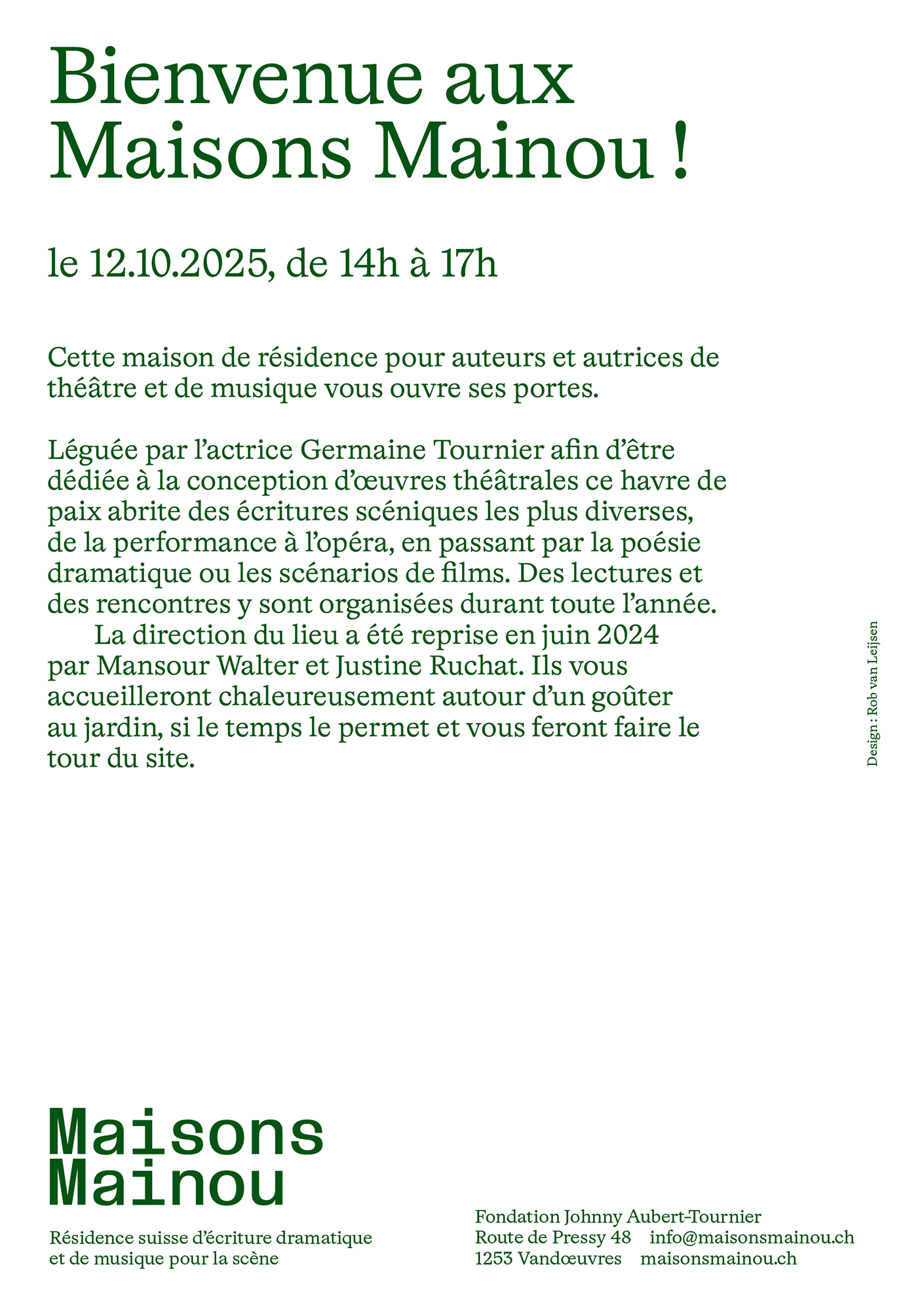 Au cœur d’un cadre magnifique, à Vandœuvres, dans la campagne genevoise, les Maisons Mainou accueillent en résidence des auteur.ice.s de théâtre, de musique pour la scène.